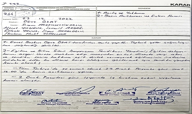 Eğitim ve Bilim Gücü Dayanışma Sendikası (Eğitim Gücü Sen) kurulduğu günden bu yana eğitim çalışanlarının yaşadığı sorunlara gösterdiği duyarlılıkla adından söz ettirmektedir.Eğitimcilerin yasal ve sosyal statüde özlük haklarının korunması ve iyileştirilmesine yönelik mücadele veren sendikamız yaptığı basın açıklamaları ve eylem kararları ile eğitim çalışanlarının başta geçim sıkıntısı olmak üzere sahada da karşılaştıkları problemlere en üst perdeden tepki göstermekten hiçbir zaman vazgeçmemektir. Gelinen noktada eğitim çalışanlarını asgari ücrete mahkûm edip maaşından en üst düzeyde vergi alan ve sendika seçim hakkına eşit destek vermeyerek eğitimcinin iradesine müdahale eden bu düzene karşı olduğumuzu göstermek için tüm Türkiye’de eş zamanlı olarak 29 Aralık 2022 Perşembe günü saat 16.00'da basın açıklaması yapma ve 2 Ocak 2023 Pazartesi günü kurumda bulunarak iş bırakma eylem kararı alınmıştır.